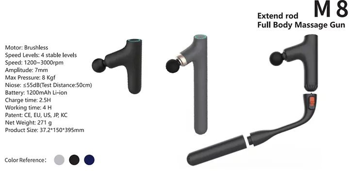 The Full Body Massage Gun with extension handle is new trend of massage gun in market, as a top 10 massage gun manufacturer, we have several new development, with 2 length of extend rob easily assemble on Full body massage gun to reach different body place.